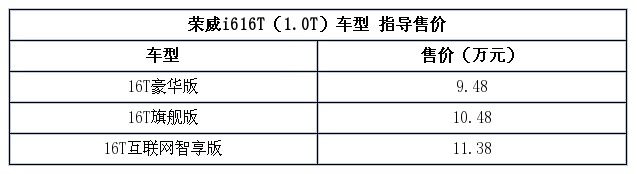 在本届上海车展上,上汽荣威i616T(搭载1.0T发动机)正式上市,新车推出3款车型,售价区间为9.48-11.38万元,新车与现款20T(1.5T)车型最大的差异在于搭载了一台直列三缸1.0T发动机,其最大功率125马力,峰值扭矩170牛·米,并提供6速手动和7速双离合两种变速箱。底盘方面,16T车型采用了20T低配车型一样的扭力梁式后悬架。