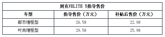 上汽通用别克VELITE 5于车展期间正式上市,指导售价为26.58-29.58万,享受3.6万元别克蓝新能源车型购车补贴后,售价区间为22.98-25.98万元。新车是别克品牌旗下首款增程式插电混合动力车。官方给出它的纯电行驶里程为116公里,单次加油的综合续航里程则达到了768公里。此外,购买VELITE 5的消费者还可享受18期免息超值金融方案、三年城际旅途保障服务、十年免费保养及三年上门车辆双检等优惠或服务项目。