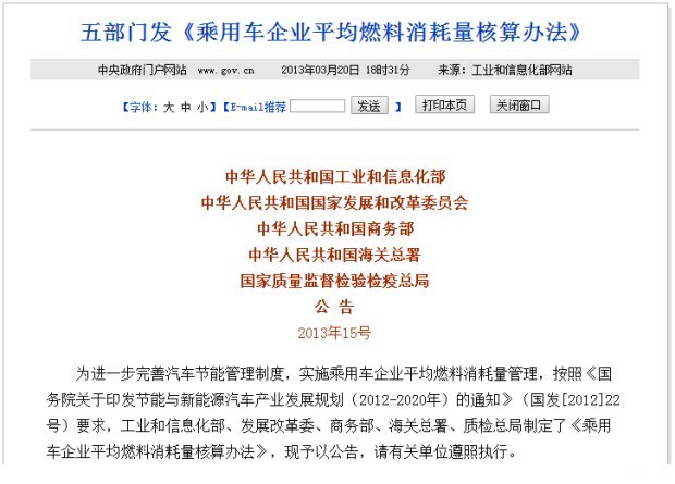 2013年,国家工信部、发改委、商务部、海关总署、质检总局五部门联合制定了《乘用车企业平均燃料消耗量核算办法》(全文可见第三页附录),该《办法》建立了乘用车企业平均燃料消耗量核算及通报制度。