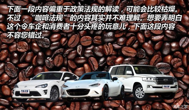 [汽车之家新闻] 在刚刚过去的4月份,一条大意为“丰田86与斯巴鲁BRZ即将停止进口”的消息传遍互联网,引发了网友们的广泛讨论。在消息刚刚爆出时,我的同事王梓冰在第一时间通过咨询丰田及斯巴鲁经销商核实了这一信息(详见《真的要说再见了 BRZ/丰田86行情小调查》)。而关于这两款入门跑车在华停售的缘由,圈内大V和专家们也是众说纷纭,不过其中被提及最多的词汇当属“CAFC”和“咖啡法规”了。那么,他们说的CAFC、咖啡法规究竟是何方神圣?为什么它们会影响车企的产品布局和消费者的购车?车企又因为它们作出了哪些牺牲?下面,我们就来为您揭开其中的原委。