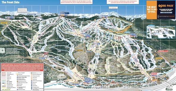 布雷肯里奇的滑雪区域占地2908亩,其中近三分之一的面积每天都可使用,感谢喷雪炮,这些雪道上常年有雪。这张正面地图展示了滑雪道有多么丰富多样,以及这片度假胜地的基础设施又有多么复杂。