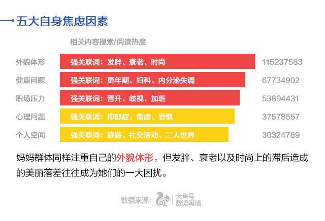 除此之外,妈妈们自身也压力重重。对于天性爱美的女性而言,妈妈们同样也注重自己的美感。从UC大数据报告可看出,在自身焦虑因素中,对于外貌体型资讯的关注与阅读热度远超其他类别,年龄增长带来的外貌体型变化与健康问题是妈妈们普遍的困扰。