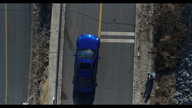 初次飞行也许飞出这样的连续航线也有困难,这里还有一个更简单的办法:抬高镜头。在镜头垂直向下拍摄时开启录像,然后用遥控器上的滚轮抬高角度。这样也可以跟拍起步速度很快的轿跑车。
