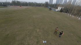 在航拍视频的最后,别忘了来一个潇洒的告别:在一个比较低的高度俯拍自己,让身边的同步一起向天空挥手,然后同时推爬升与后退的操纵杆。