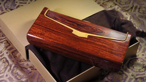 正是这把唐琴赋予了“端木良锦”设计灵感。后者不仅借鉴其纹样,设计出“满嵌唐琴纹手拿包”上的四边花菱纹和六边花纹,而且复原了旧日的木镶嵌技艺。阳光下,每一朵花都显现出木料本身的纹理。轻推木质卷帘,发现包体也是由整木凿空而成,拿起来轻盈适手。