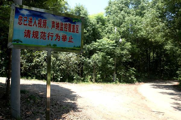 从纪山寺前往楚庄王墓的三叉路口,提示牌与视频监控探头清晰可见。