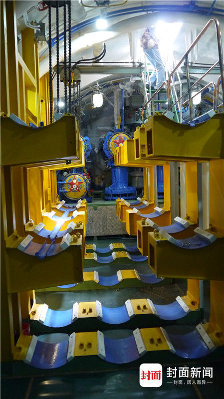 再向前就是主机舱。在这里,通过蒸汽轮机推动主齿轮减速箱来带动轴系,为潜艇航行提供动力。