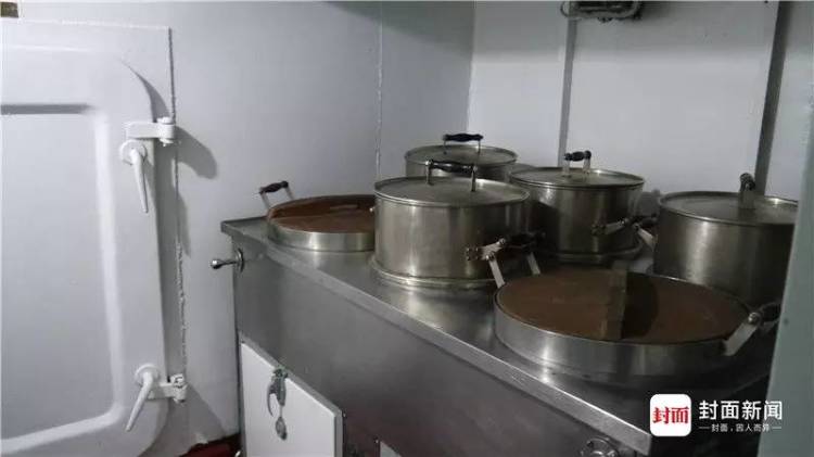 厨房很小,一侧是案台,一侧是蒸煮区域,在这里每天要出满足艇上100多人的用餐食物。