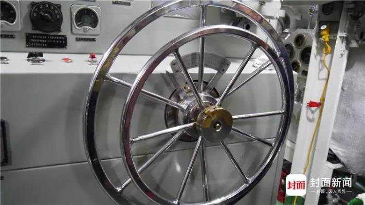 进入舱室后,可以看到有一大一小两个圆形舵轮,通过这两个舵轮来实现潜艇前进或后退,在舵轮的上方是一个指示表,可以看到潜艇的运行状态以及运行速度。