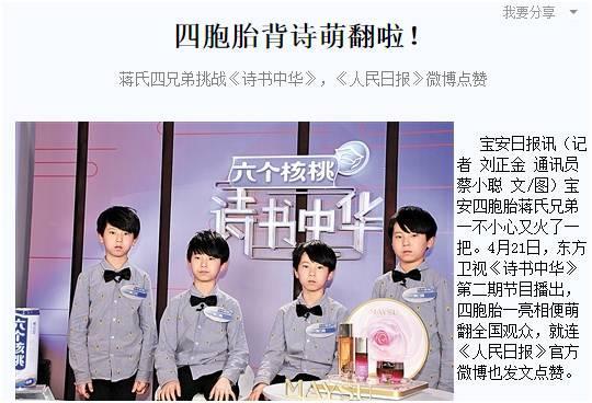 在刚刚过去的周末,这四胞胎又在东方卫视的《诗书中华》节目中火了一把。