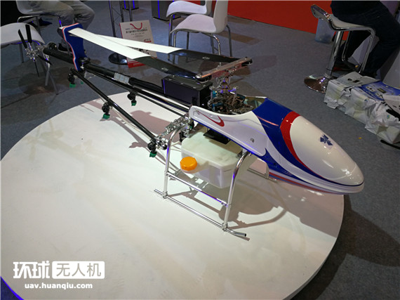 载荷20公斤的电动直升机。工作人员对环球网无人机频道表示:直升机的效率高得多,所以同样载荷的直升机体积小得多、下压风场也强。但缺点是技术复杂,飞手的培训也更困难。