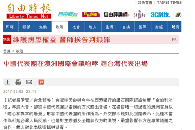 该报形容中国代表的做法是对会议的“干扰”,而“干扰”的动机在于,现场有台湾代表出席。