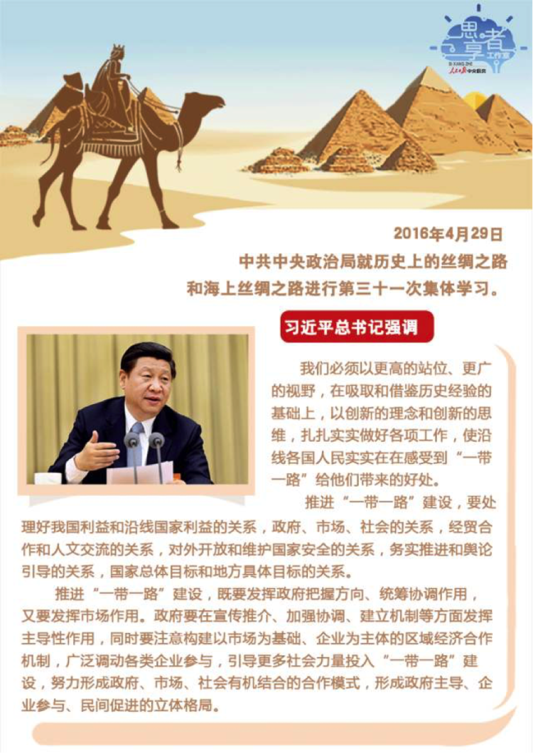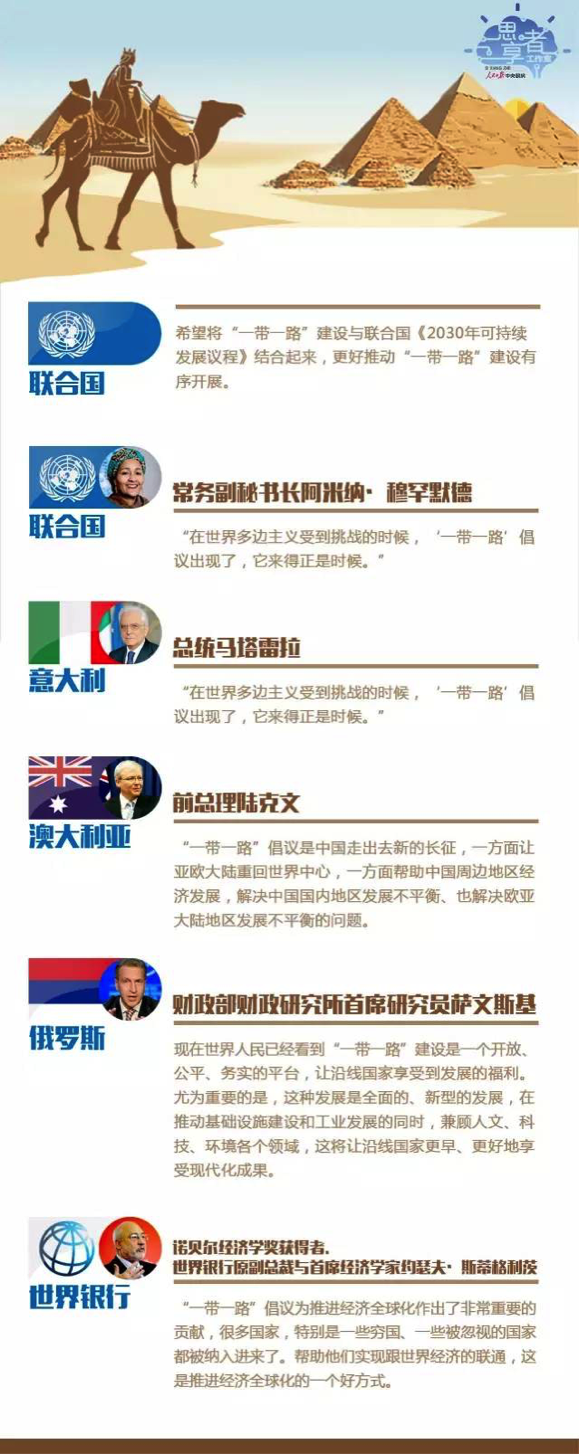 ■ 正如习近平总书记2017年1月17日在达沃斯论坛年会开幕式上所讲的那样:“‘一带一路’倡议来自中国,但成效惠及世界。”事实已经证明并将继续证明,“一带一路”倡议是伟大的构想,“一带一路”建设是伟大的事业。深入贯彻落实习近平总书记关于“一带一路”建设的重要思想,就要在充分吸取和借鉴历史经验的基础上,以创新的思维和不懈的努力,不断推进和深化“一带一路”建设,使其进一步扎根开花结果,更好地服务于中华民族的伟大复兴,更多地惠及沿线国家和世界人民。 (人民日报中央厨房·思享者工作室 张怡恬 张垚 殷鹏)