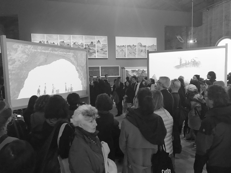 邱志杰:中国馆的媒介和材料都非常多样,从非常传统的水墨画到显得很民间的皮影戏,再到戏剧、刺绣都有。目前引发关注比较多的是两位非物质文化遗产大师:皮影制作技艺传承人汪天稳和苏绣传人姚惠芬。他们的作品在当代艺术展上不是肤浅的使用。比如,我们在展厅里做了一个规模相当大且很复杂的皮影剧场,把传统的皮影表演进行了很大改造。投影的光源以前是煤油灯后来改成电灯,现在我们把它变成实时切换的录像投影,连字幕都投在上面。馆内展厅中央设置了3个皮影表演和录像投影屏幕。有一个屏幕是非遗大师操作;一个屏幕是年轻艺术家操作,包括威尼斯美院的留学生;第三个屏幕由一台自动机械来操作。乐队是来自陕西华县的皮影剧团。这是特别文化边界的做法,很难分清什么东西是所谓的当代艺术,什么东西是所谓的民间艺术,什么东西是所谓的非遗。从现场效果看,基本上只要一开演,观众都晕了,特别喜欢。它的魅力和效果是显而易见的。