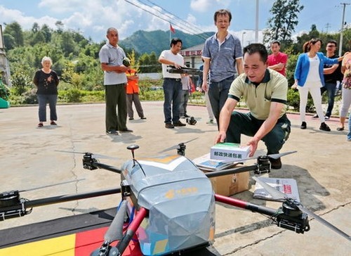 2016年9月,中国邮政开设了一条无人机邮路。无人机将信件等从镇上送到了偏远的山村。接收信件的并不是最终的收件人,而是村里的邮递员。