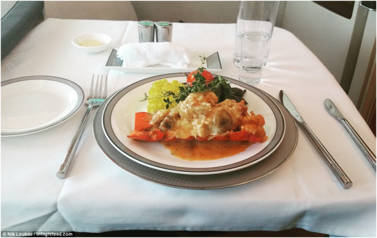 爱琴海航空公司是另一个最受劳卡斯喜欢的美食航空公司。图为从布鲁塞尔到雅典商务舱中,劳卡斯的鸡肉沙拉美食体验。