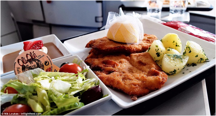 劳卡斯飞往世界各地只为品尝飞机餐。图为劳卡斯花费14欧元(约合人民币105元),在FlyNiki航班上品尝的最美味炸鸡排,配上欧芹土豆,再来上一份沙拉和浓情巧克力慕斯,感觉真是不要太好。