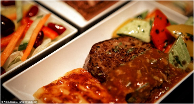 图为佩戈萨斯航空公司供应的飞机餐,从伊兹密尔到伊斯坦布尔一个小时的飞行中,劳卡斯大饱口福,品尝了鲜嫩多汁的牛排配烤蔬菜、烤土豆、土耳其沙拉,以及餐后甜点巧克力蛋糕一份。