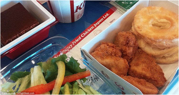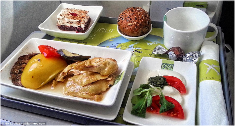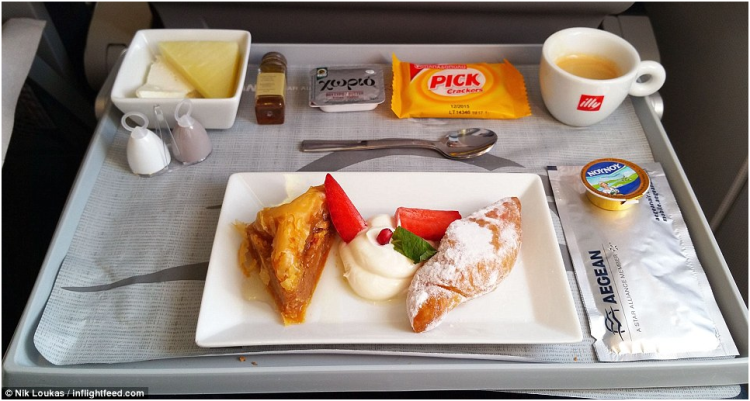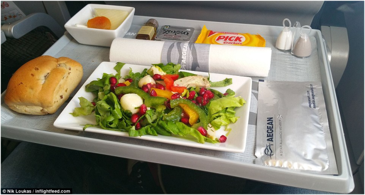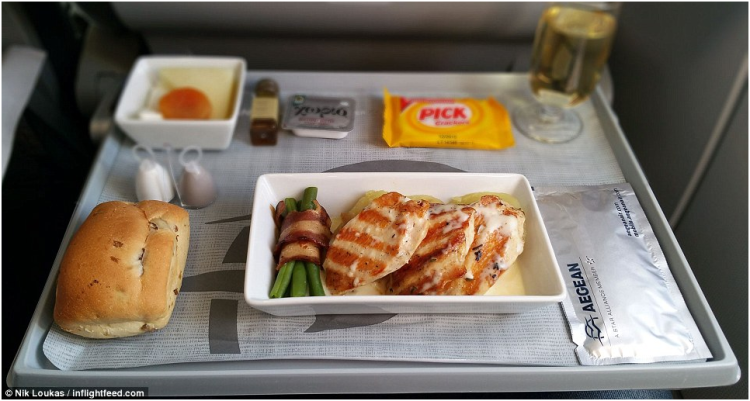 爱琴海航空公司还会供应炸鸡块、和洋葱薄片一起油炸的土豆片,青豆和土耳其柠檬百里香熏肉。