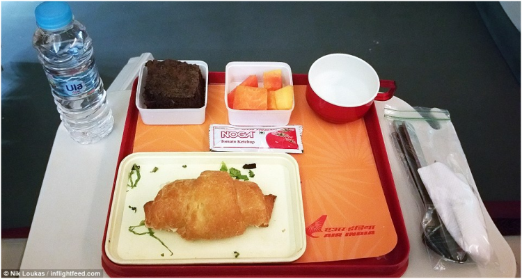 图为德里至巴黎的印度航空公司航班提供的飞机餐,只有一个简单的羊角面包,尽管配有新鲜水果和浓情巧克力布朗尼,这不经破坏了劳卡斯期待已久的心情。