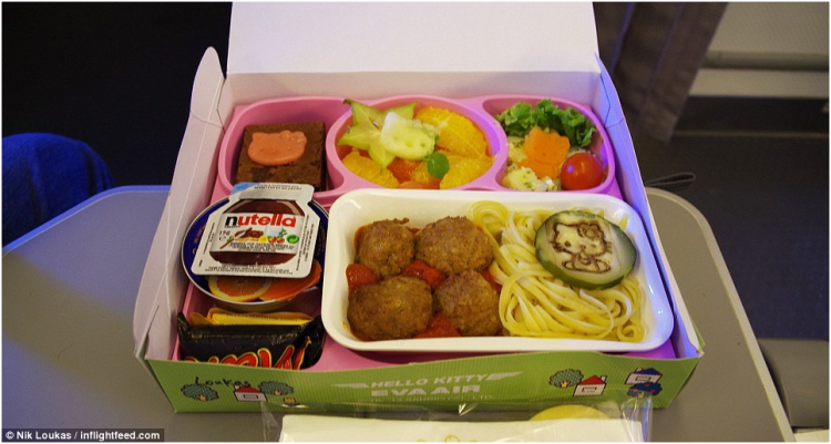 图为劳卡斯专门乘坐从巴黎飞往台北的长荣航空公司航班去吃的凯蒂猫儿童套餐,量足质优的套餐以面条和肉丸搭配土豆沙拉、新鲜水果、巧克力和巧克力布朗尼。