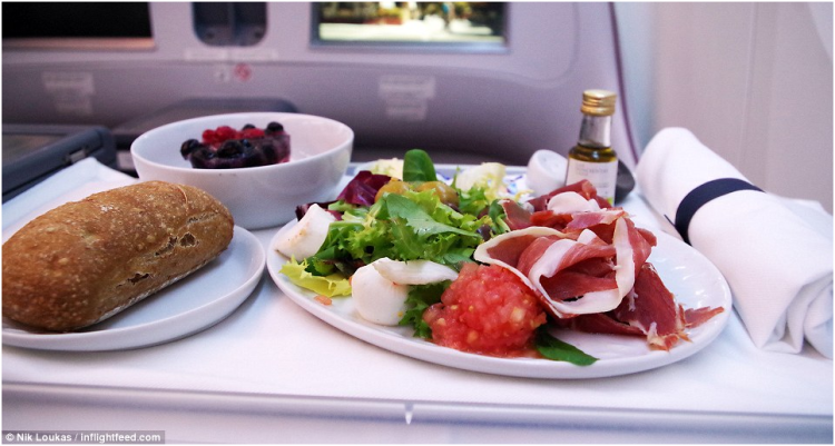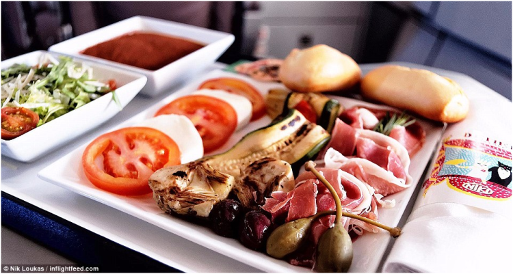 图为FlyNiki航班提供的另一热门飞机餐,意大利开胃菜盘搭配迪帕尔马火腿,意大利番茄沙拉,烤地中海蔬菜和提拉米苏甜点。
