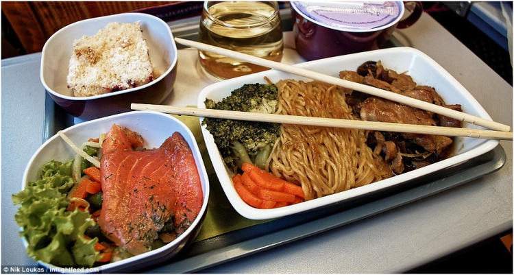 图为昆明至曼谷泰国航空所提供飞机餐,劳卡斯非常喜欢这次提供的特色猪肉面条,鲑鱼色拉和大量的新鲜蔬菜。