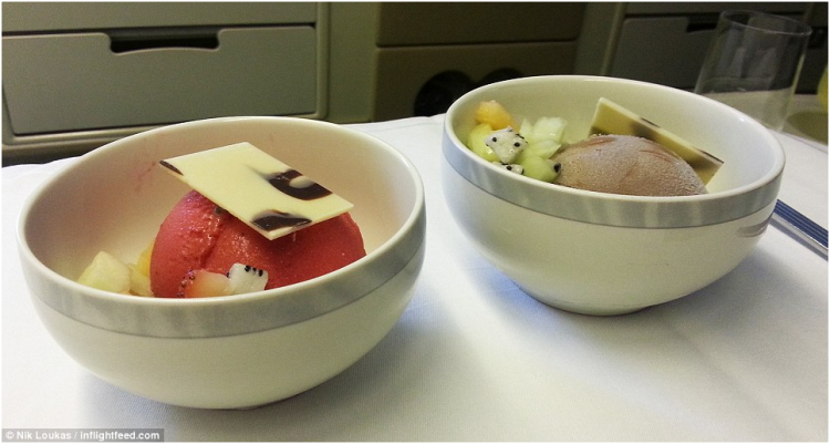 图为新加坡航空公司航班所提供的飞机餐,劳卡斯惊奇地发现甜点竟是哈根达斯,而且口味由自己选择。