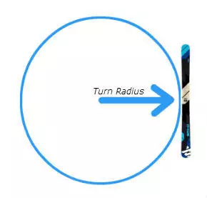 转弯半径单位为米,指的是当雪板立刃滑行时所走弧线所在圆的半径。板头板尾与板腰宽度差值越大,转弯半径越小。另外,使用小转弯半径的双板做更大转弯动作远远简单于使用大转弯半径双板做短转弯动作。