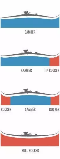 拱形(Camber)双板拥有最传统的外形,置于平地时板子中心向上弯起。这一设计拥有最大的有效板刃、稳定性以及道内滑行的回弹力。