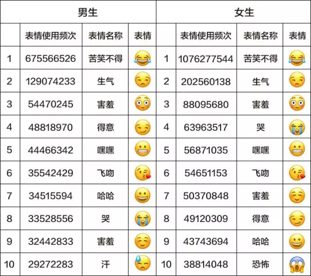 聊天时使用表情符号,已是青年网民们必不可少的输入习惯了。使用次数TOP10的表情符号里,“哭笑不得”的表情使用次数最多,总计高达7518440701次,受欢迎程度可见一斑。
