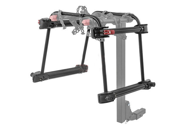 其次是这个架子。浅灰色的部分是自行车架,与拖车钩相连,只用它就可以在车尾架自行车。而黑色的部分是架在自行车架上面的雪板架。两边都可以固定雪板。