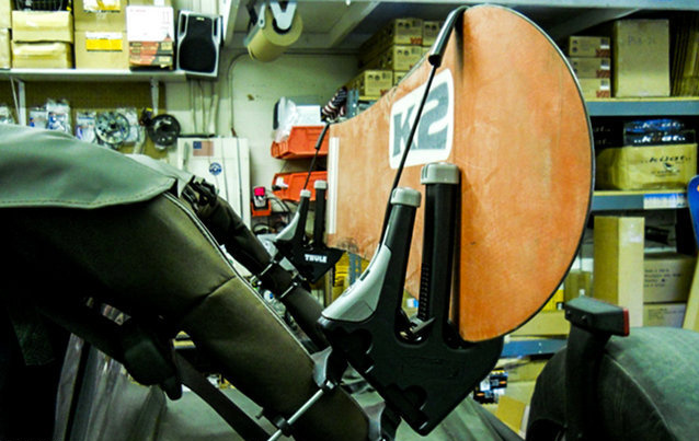 还有一种放雪板的方法是图上这样,架在车后面。这又是怎么安装的呢? 这个车架的构造分三部分:拖车钩、自行车架、雪板架。