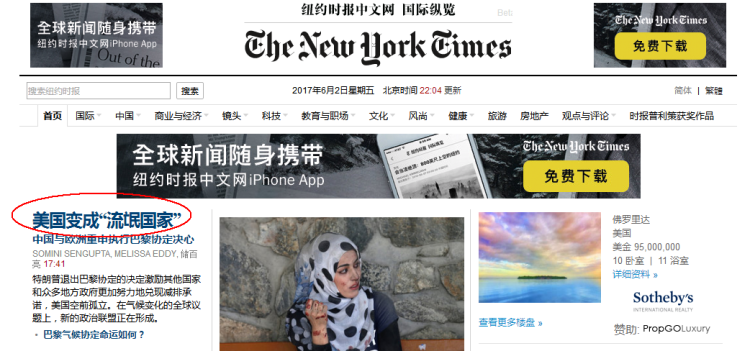 美国《纽约时报》6月2日发表了题为“美国变成‘流氓国家’,中国与欧洲重申执行巴黎协定决心”的文章,内容如下: