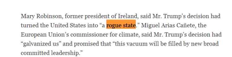 前联合国气候变化特使、前爱尔兰总统玛丽·罗宾逊(Mary Robinson)在一份措辞犀利的声明中说:“美国违反对《巴黎协定》的承诺,使其成为国际舞台上的流氓国家。”