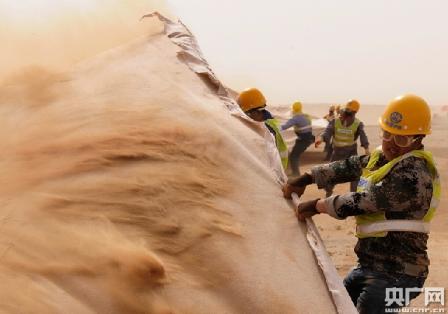 沙漠龙:在巴丹吉林沙漠,沙土每年平均移动速度大约有18米,如果不固定住移动沙丘,流沙很容易覆盖公路。固沙关键是一个个2米长、20公分宽的填充式黑色沙袋。这些沙袋呈田字形交叉叠放,然后形成一个个1平方米的小方格,连成一片。沙袋在设计很特别,是有鳍沙袋,编织袋边沿会留出3公分的穗儿,别小看这些穗,不单能减小风速,还能把吹起来的沙留在框格内。沙袋的面料采用的是耐寒耐晒材质,至少可以保持20年。第一项目部工程师王大伟说,根据风向,不同路段、不同方向铺设的沙袋群,宽度都有精确计算。