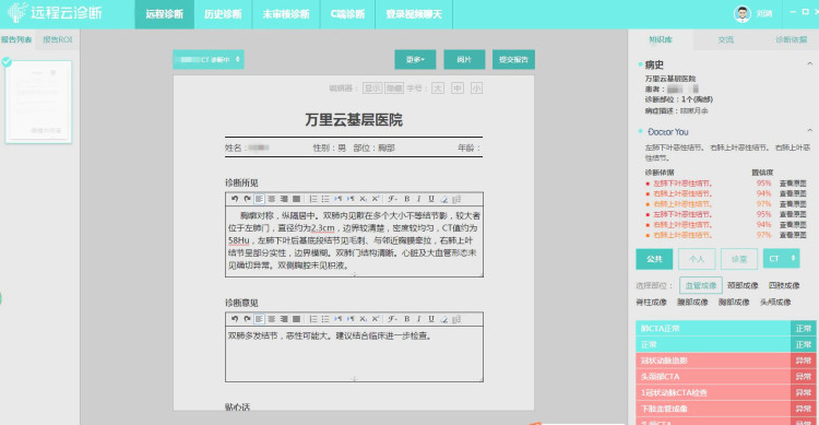 11日,由阿里健康研发的医疗AI“Doctor You”,在北京万里云医学影像中心正式对外发布,根据阿里健康官网介绍,“Doctor You”AI系统包括临床医学科研诊断平台、医疗辅助检测引擎、医师能力培训系统等。而这一次,阿里健康和万里云对外展现的,是“Doctor You”中CT肺结节智能检测引擎在远程影像诊断流程中的真实应用场景。