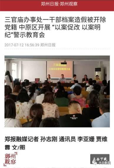 《郑州日报》新媒体刊发的这篇文章题为《三官庙办事处一干部档案造假被开除党籍 中原区开展 “以案促改 以案明纪”警示教育会》的文章。文章显示,河南通报了一起“蝇官巨腐”的案例:涉案人5次修改出生日期,晚退休8年,伪造材料帮儿子入党入编入职。