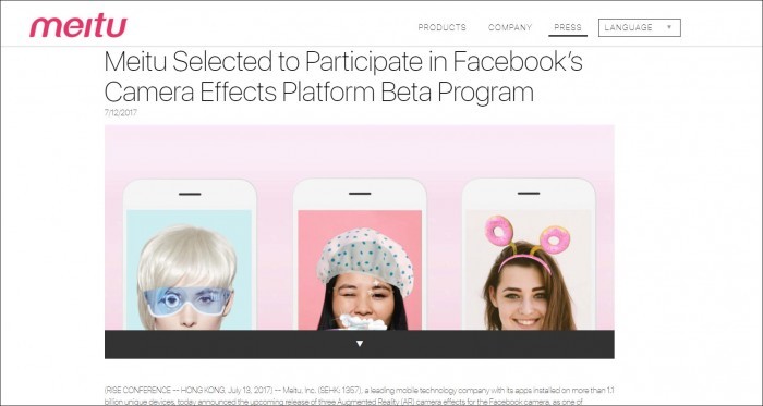 美图是中国最受欢迎的互联网品牌之一,其照片和视频编辑工具每月超过4.5亿人使用,每月创造超过60亿张照片和视频。美图是第一家专门从事AR面部识别技术的公司。