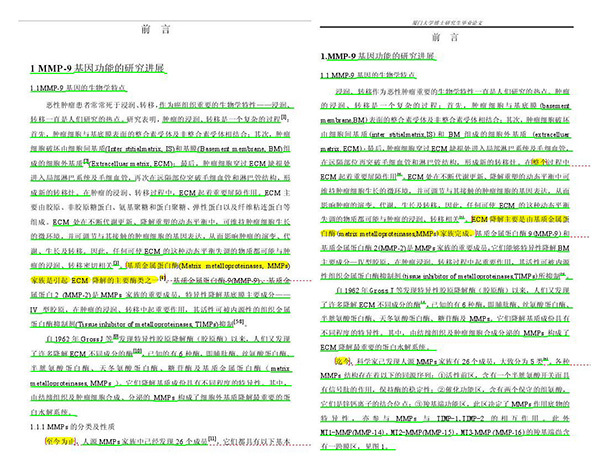 在更改语序上,蔡文前言的第一句就对黄文做了语序改动。黄文前言的第一句为“恶性肿瘤患者常常死于浸润、转移,作为癌组织重要的生物学特性——浸润、转移一直是人们研究的热点”,而蔡文中将“浸润、转移”提前,精简为“浸润、转移作为恶性肿瘤重要的生物学特性一直是人们研究的热点。”