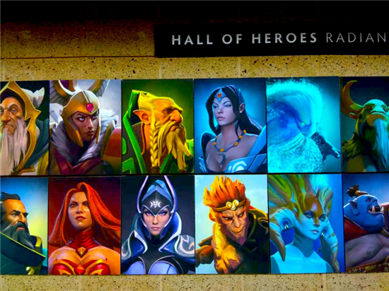 刀塔2有100多个英雄人物,当然就是这次比赛的主角。场内的墙面上展示了“英雄墙”。