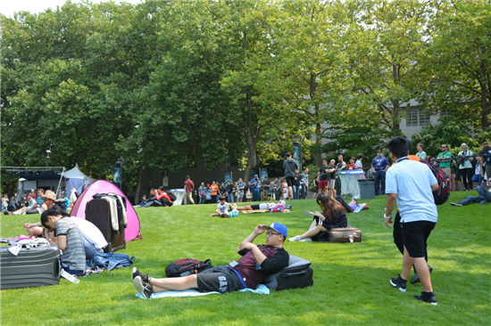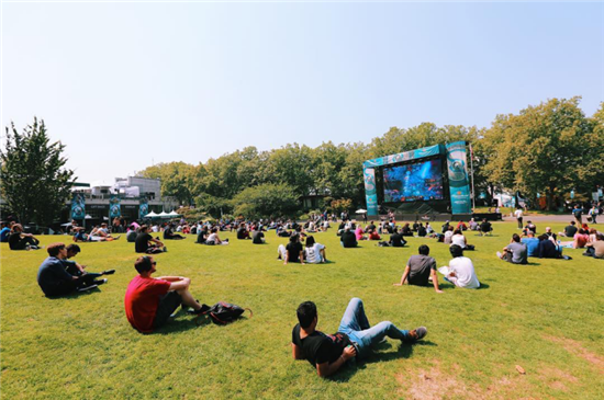懂得享受的美国人,还为会众搭建了草地上的露天舞台。不少人乾脆草地上野餐,还有人选了个舒服的姿势,躺着在草地上享受阳光沐浴,同时幸福地观赛。