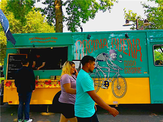 因此,没有买到票又希望能一睹激烈战况和玩家风采的观众,也能一同众乐乐。路边还有可爱的餐车,可以在美国街头享受一下电影里都会看见的热狗堡。