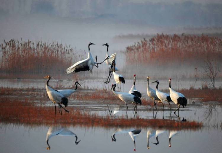 湿地里的鱼类、贝类等食物丰富,是丹顶鹤迁徙越冬的食物。