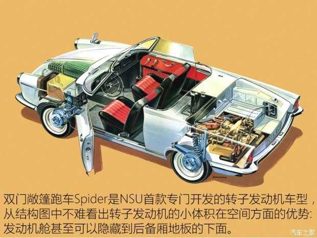 在现有车型上小试牛刀之后,雄心勃勃的NSU决定开发一款搭载转子发动机的全新车型,这就是双座的敞篷跑车NSU Spider。然而俗话说得好,理想很丰满,现实很骨感,一心想借新技术大火一把的NSU发现自己并没有能力完全解决转子发动机面临的技术难题。