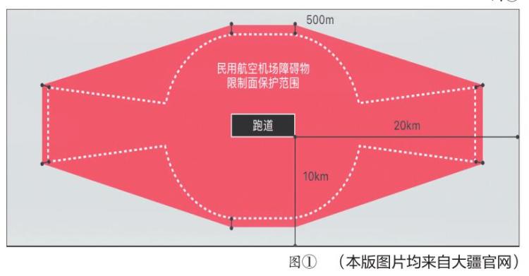 大疆将民航局定义的机场保护范围坐标向外拓展500米,连接其中8个坐标形成八边形禁飞区,并在跑道两端终点向外延伸20公里,跑道两侧各延伸10公里,形成约20公里宽、40公里长的长方形限飞区。(图①)