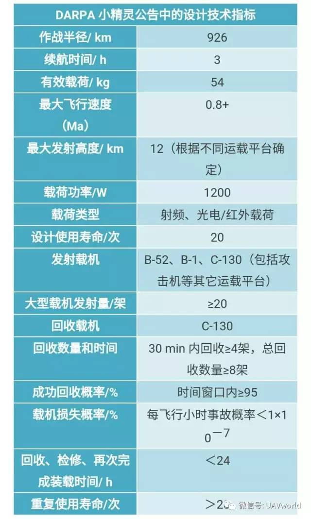 2016年3月,DARPA小精灵项目第一阶段合同授予四家公司:复合材料工程公司、美国Dynetics公司、通用原子航空系统公司和洛马公司,发展能以集群作战方式饱和攻击敌防空系统的廉价小型无人机技术解决方案。这些无人机将配备多种不同载荷,采用齐射方式,具有数量大、尺寸小、廉价、可重复使用等特点,其关键技术包括:空中发射与回收技术、设备载荷与机体一体化概念设计、低成本结构设计、有限寿命设计、自动复飞策略、精确数字飞控与导航、小型高效涡轮发动机、发动机自动关机技术、小型分布式载荷集成技术、精确位置保持技术等。