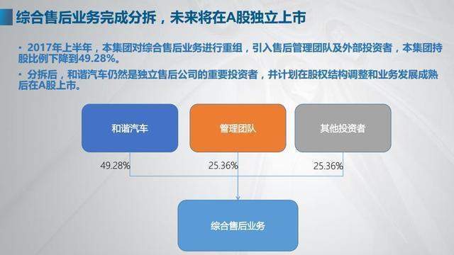 2017年6月29日,独立售后公司宣布引入管理团队和外部投资人投资,该次交易完成后,和谐汽车贸易、售后管理团队及外部投资人将分别持有独立售后公司49.28%、25.36%、25.36%的股权。该次交易完成后,公司仍然是独立售后公司的重要投资者,根据估算,独立售后业务将在2017年底实现全面盈利,依托2017、2018、2019年3年连续盈利,将在2020年完成登陆A股主板上市,5年后年收入达到30-50亿,实现10%净利润,A股市值将达100亿人民币。