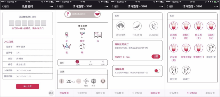 比如,情诗实现了无卡入住,手指轻轻一滑即可打开房门;进入房间后无需手动开关,便会灯随人亮,乐随人起;五种情景模式随意选择,总有一种最合心意;一键开关窗帘,遥控空调,呼叫前台……