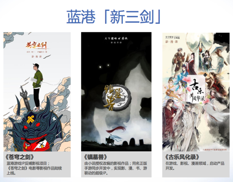 第三,蓝港「三剑」的全新考虑。移动游戏的「三剑」在早期移动市场刚爆发的时间取得了相对不错的成绩。我们针对产品持续打造「新三剑」,今年的新三剑是影漫游三部作品,包括三款影漫游联动的头部IP,一个是《苍穹之剑》,这是第一款由蓝港自主原创的游戏IP反哺到影视、动漫、文学全产业链的IP产品。第二是《古乐风华录》,取材于一个非常优美的漫画,是一个非常中国古风色彩的泛二次元的产品。第三个是和中国悬疑作家第一人蔡骏、「鬼吹灯之父」天下霸唱合作的《镇墓兽》,是一个反盗墓题材的产品。这三款横跨影漫游联动的IP叫做蓝港的「新三剑」。